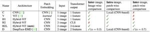 1-image models include CNN (C) and ViT (V) while the 2-image group contains DeepFace-EMD (D).