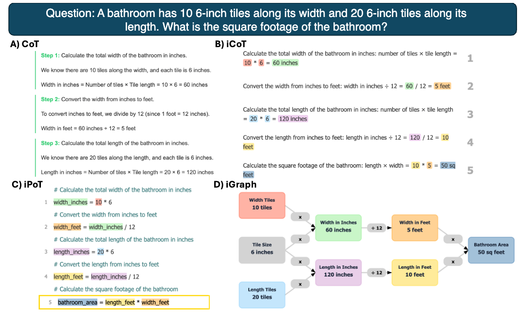 Figure 2: Examples of four explanation formats used in the study: (A) traditional Chain-of-Thought (CoT), (B) interactive Chain-of-Thought (iCoT), (C) interactive Program-of-Thought (iPoT), and (D) interactive Graph (iGraph). Each format presents the same reasoning steps in a different modality (textual, structured, code-like, or visual). For consistency, all four formats present the same mathematical problem.