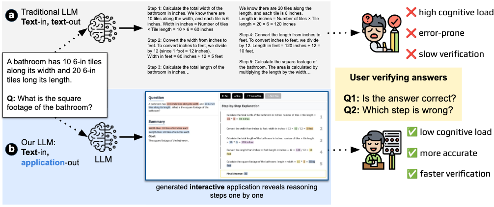 Figure 1: Given a GSM8K question, LLMs typically provide step-by-step reasoning followed by the final answer. However, such output presentation is often static and long, posing a higher cognitive load to users and leading to slower and more erroneous answer verification. In contrast, we prompt LLMs to generate an interactive HTML/JavaScript application wrapped around the reasoning. This interface enables users to verify the reasoning more efficiently via tools of (a) navigation buttons (inspired by those in common IDEs) and (b) colored highlights.